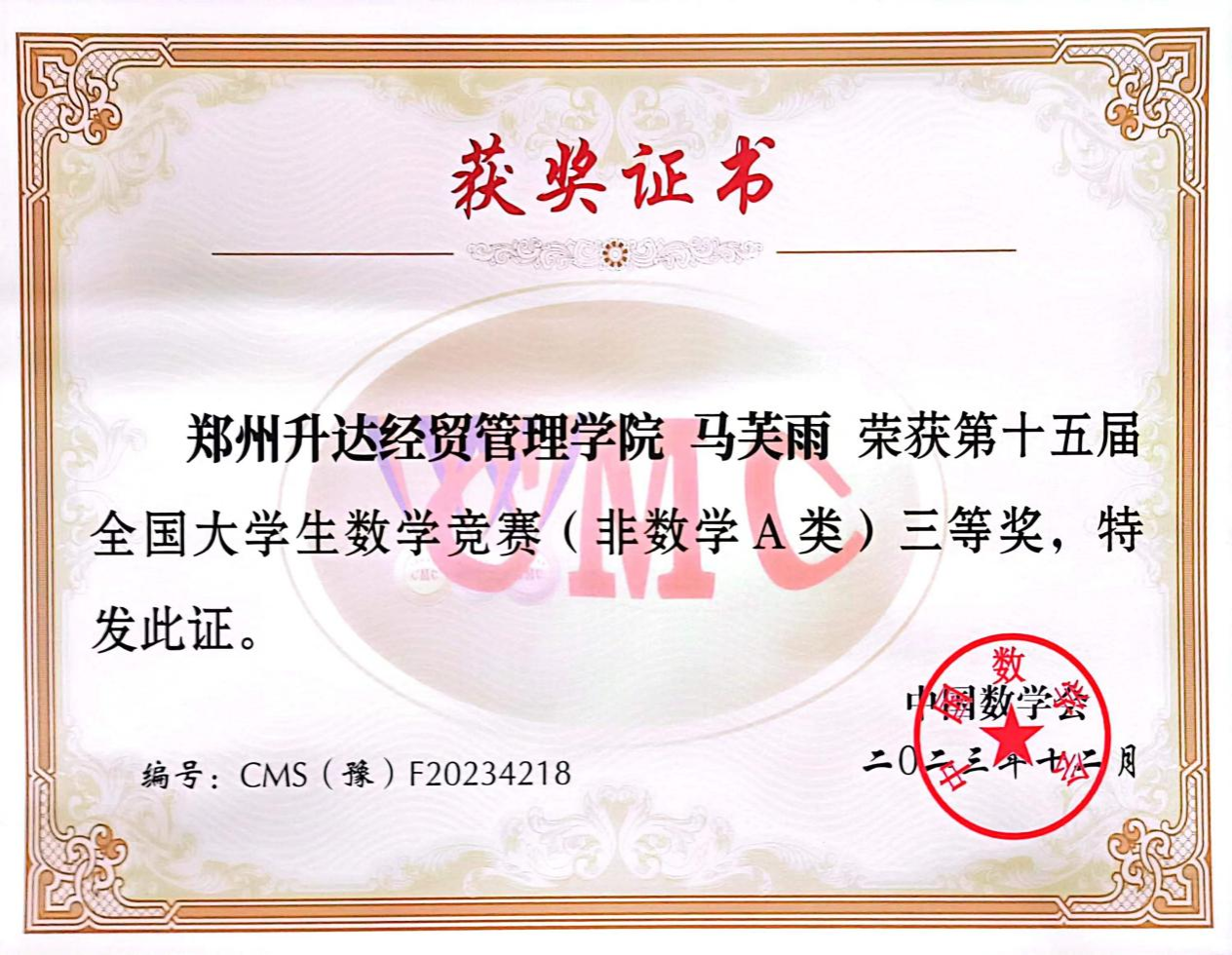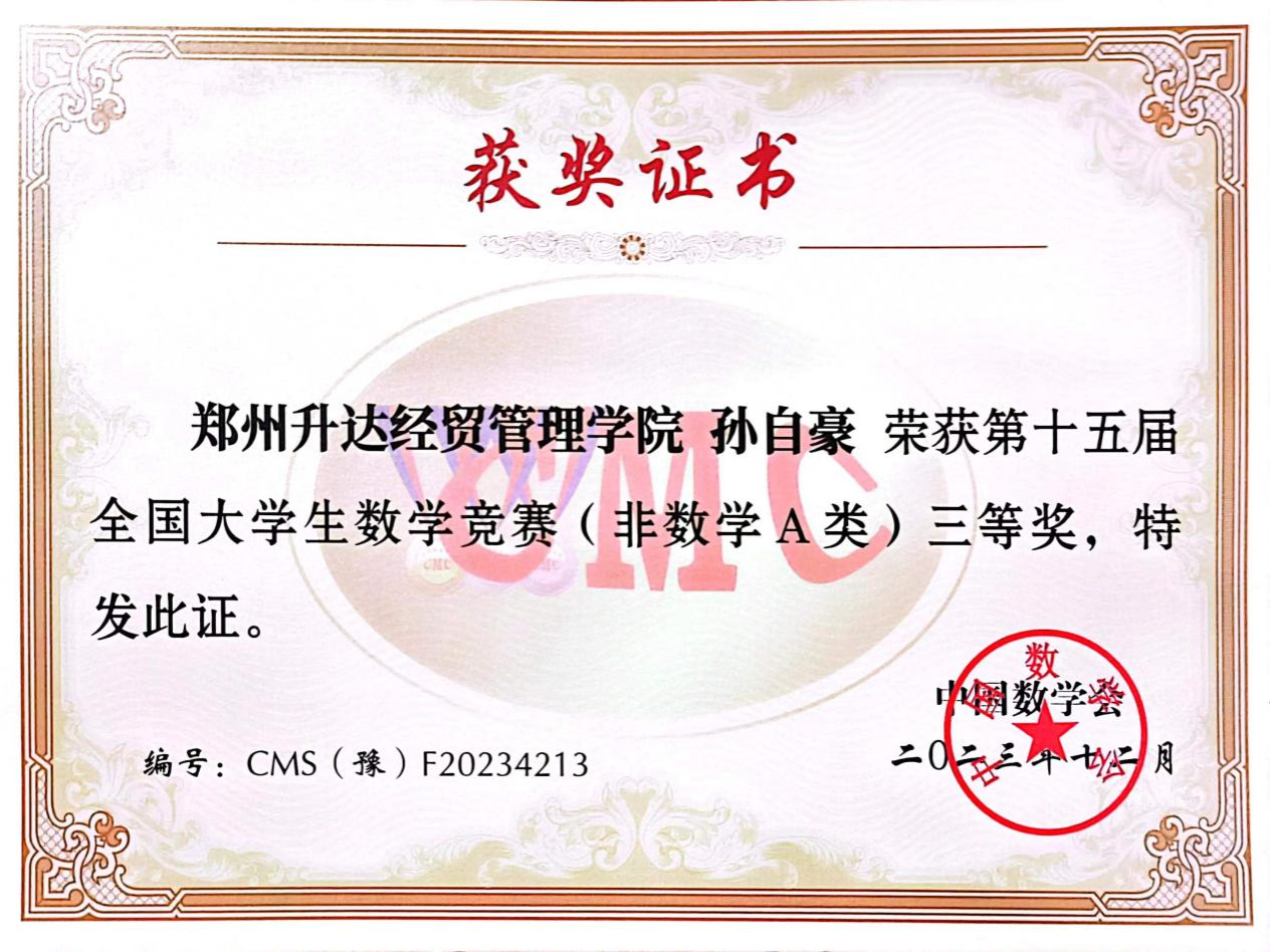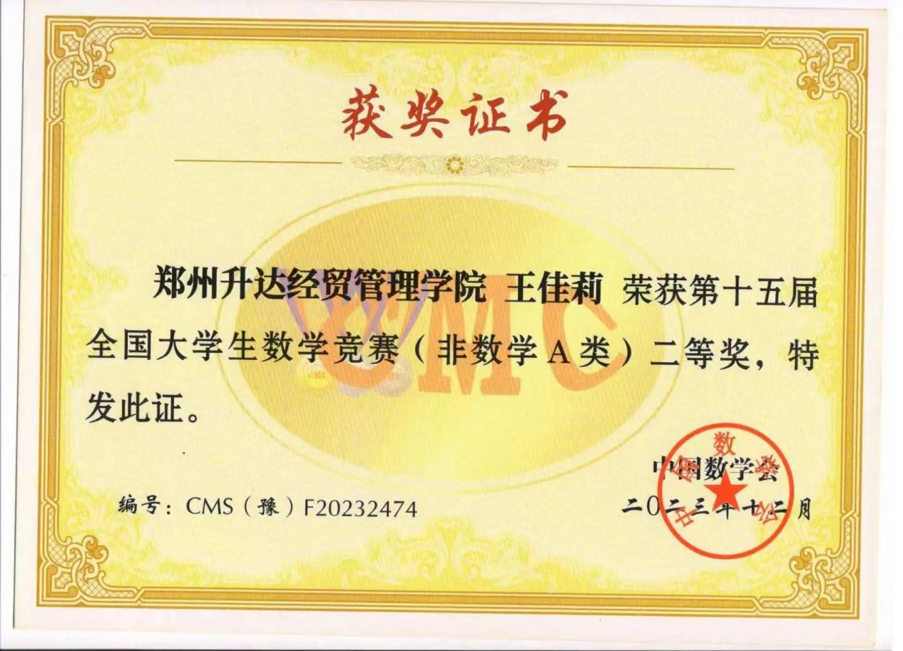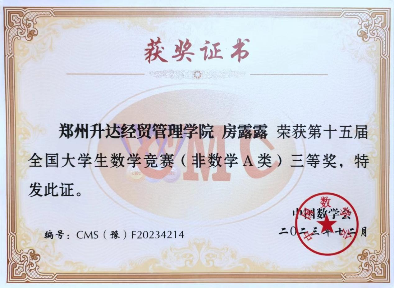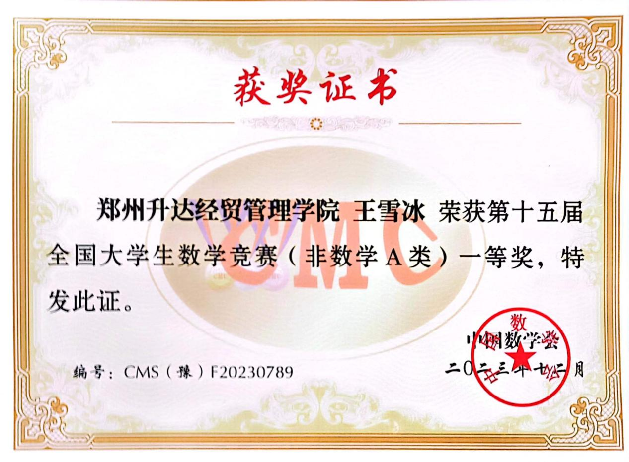 近日,2023年第十五届全国大学生数学竞赛河南赛区成绩公布,机电学院学子斩获佳绩,共有6名同学获得非数学A类奖项,其中20级汽服1班王雪冰同学获得省级一等奖,20级汽服1班李佳慧同学、20级汽服2班王佳莉同学获得省级二等奖,20级汽服2班孙自豪同学、房露露同学、马芙雨同学获得省级三等奖。