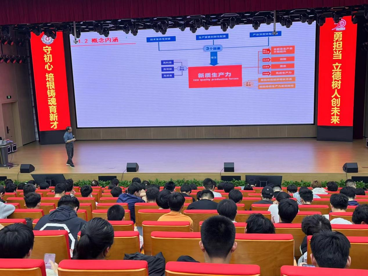 张院长以《新质生产力视域下的装备制造业发展》为题做精彩授课。他从新质生产力由来与内涵、战略新兴产业与未来产业、企业数字化转型与灯塔工厂、鲜明机械类专业特色与凸显就业优势等方面进行了详细地讲解。