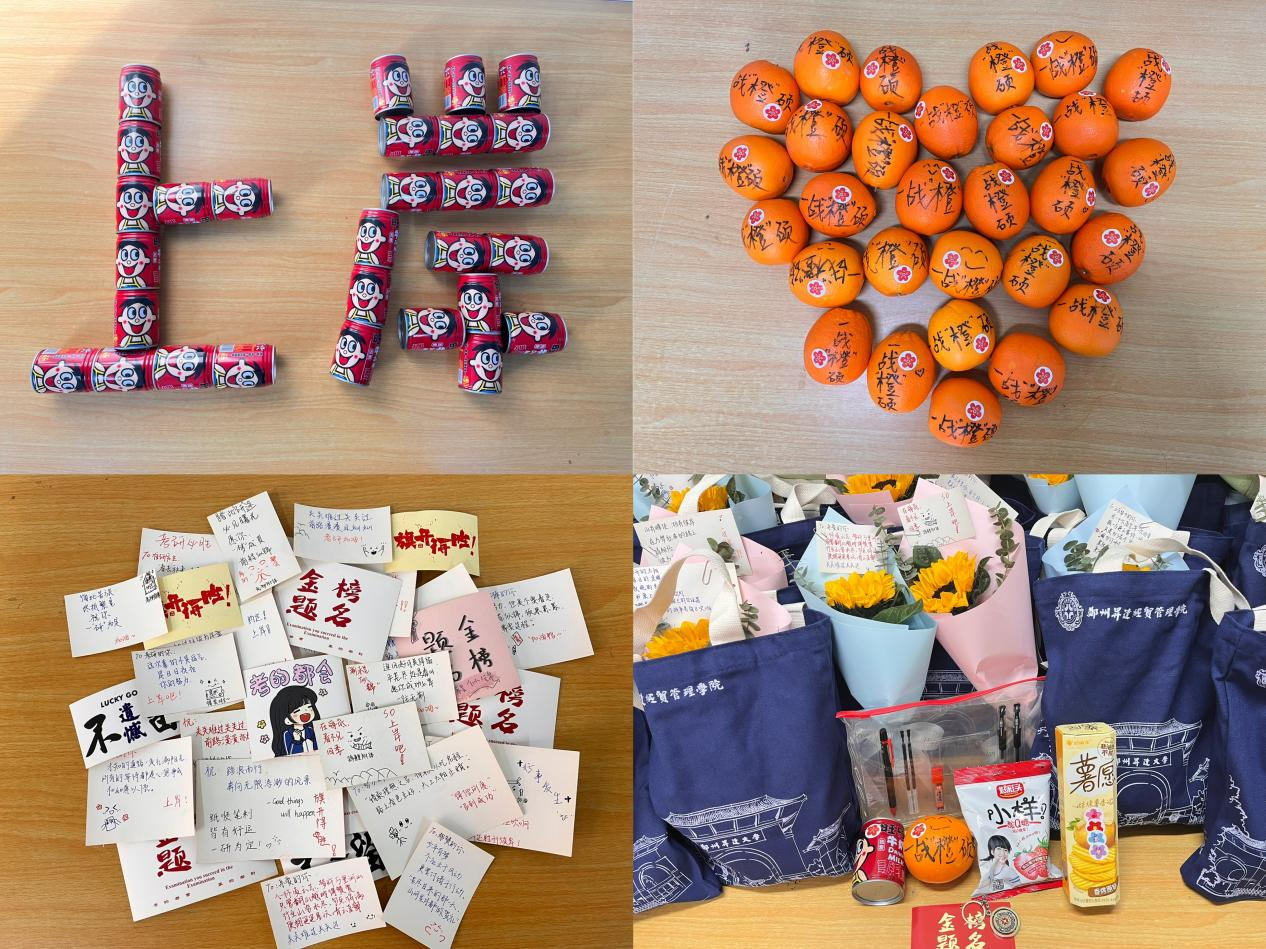 院长向考研学子发放精心准备的考研加油包,每一份礼物都承载着学院对考研学子的深切关怀与美好祝愿。加油包内包含多种寓意美好的小礼品,有寓意一战“橙”硕的橙子、象征一举夺“葵” 的向日葵、“薯”你最棒的薯片、好运旺的旺仔牛奶文具套装、学院定制钥匙扣以及手写祝福卡片等,充分彰显了学院对学子的关怀与支持。