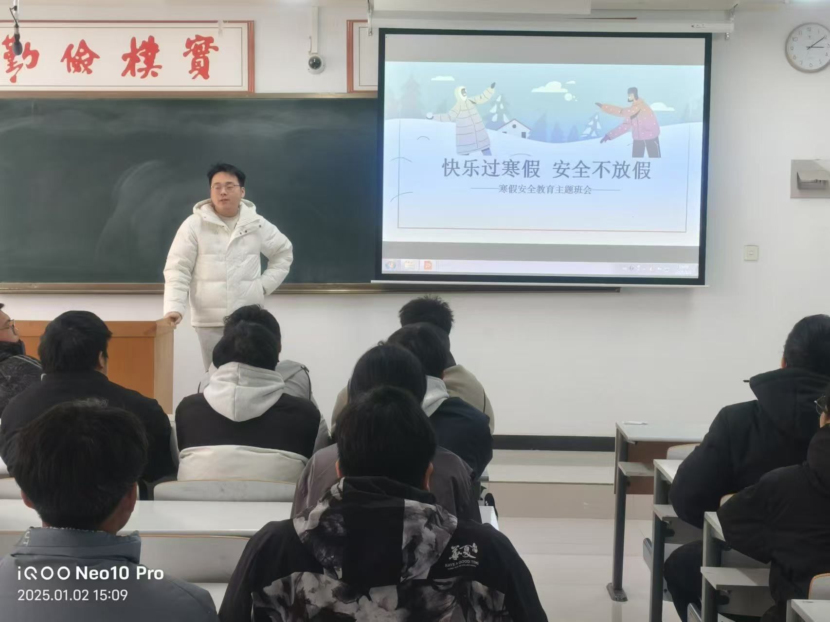 同时,辅导员老师叮嘱同学们要合理规划自己的寒假生活,回家后多做力所能及之事,在确保安全的前提下,积极参加公益活动和社会实践,服务社会、回馈社会。