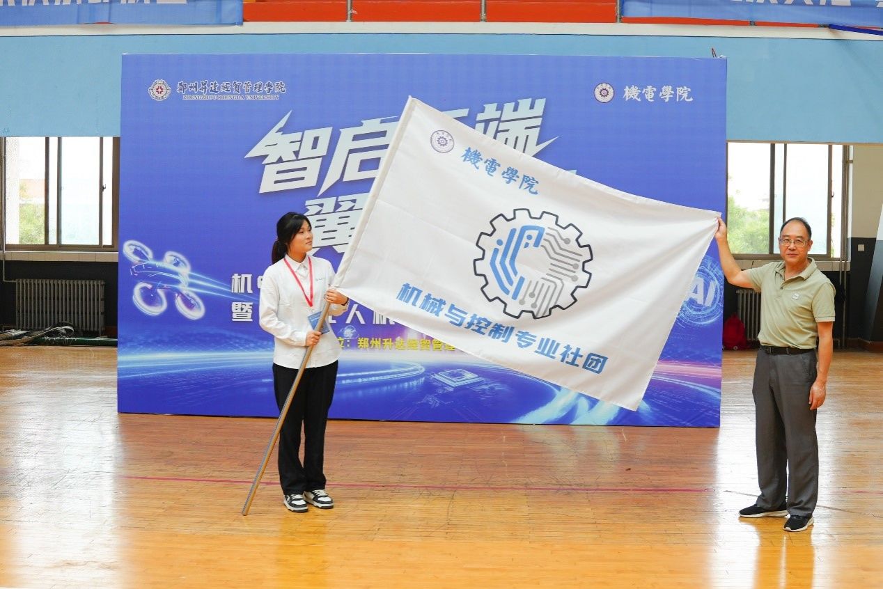 机电学院院长张三川向机械与控制专业社团学生代表李安静授旗。