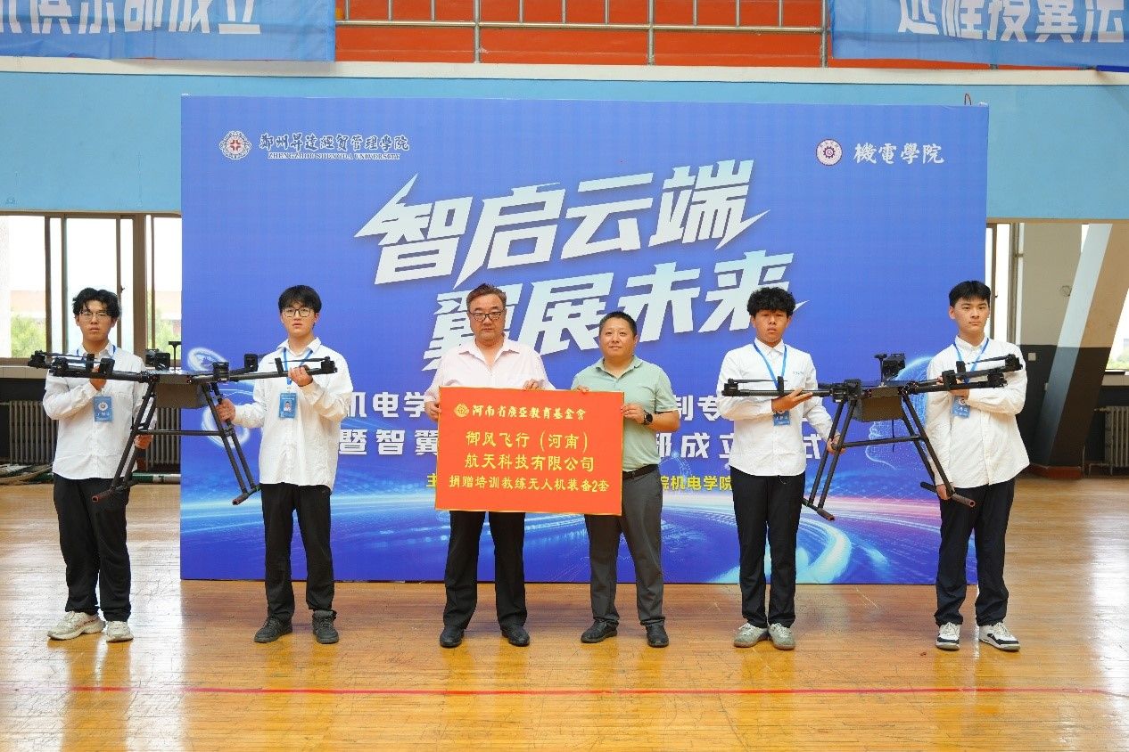 董事长王新奇代表学校接受捐赠,并向御风飞行(河南)航天科技有限公司负责人傅志成先生颁发感谢状。