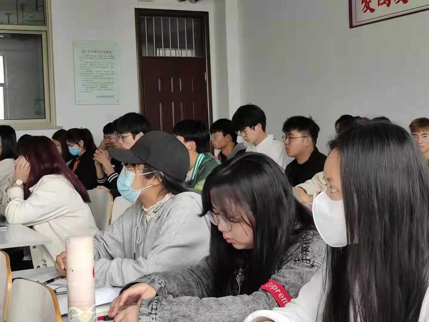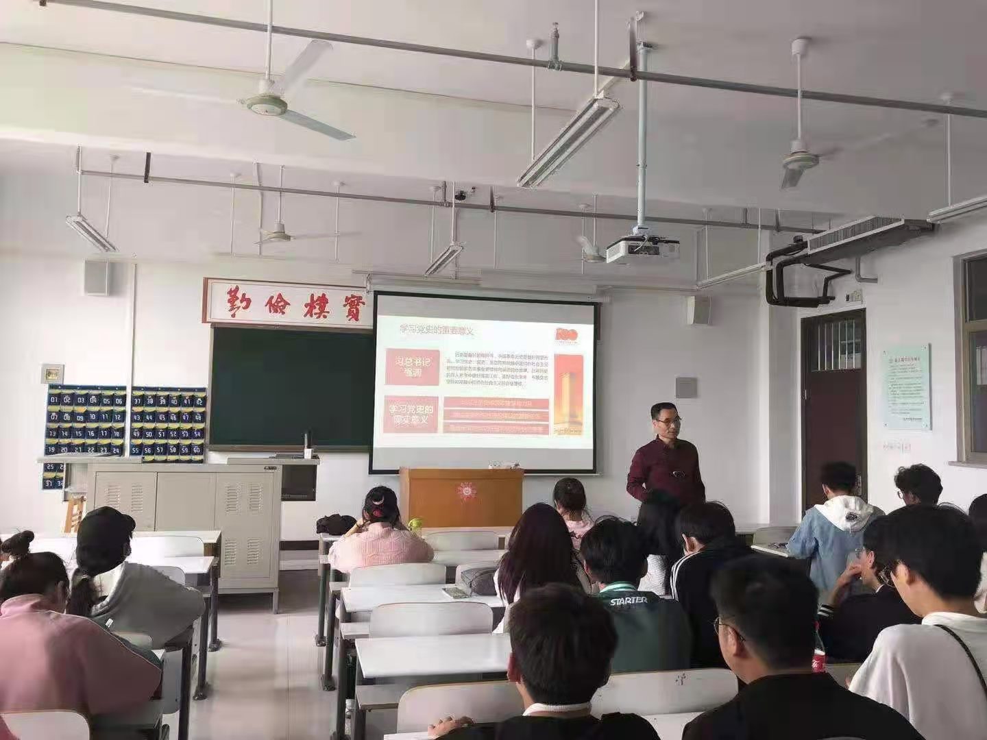 王凯老师紧密结合时代背景,深入剖析历史事件,带领同学们一起走进历史,让同学们从历史中汲取营养,从学习党史中增长才干。十月革命一声炮响为中国送来了马克思主义,以毛泽东、邓小平、习近平为代表的中国共产党人结合中国实际创造性的继承和发展了马克思主义,创立了中国化的马克思主义。我们党带领中国人民从贫穷落后的旧中国走向民主、富强的新中国,使中国人民从站起来、富起来到强起来。王凯老师反复强调思想建设的重要性,并勉励同学们认真学习党的思想政治理论,做一个有理想、有信仰、有抱负的时代青年。同学们聚精会神的聆听王老师的讲解,受益匪浅。
