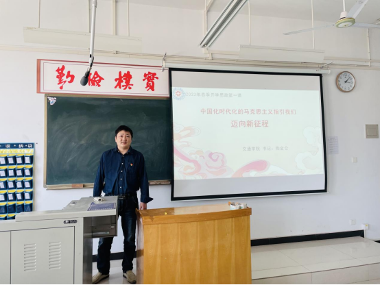 为深入贯彻习近平新时代中国特色社会主义思想和党的二十大精神,全面落实《关于新时代加强和改进思想政治工作的意见》,为教育引导同学们以热情饱满的精神面貌,迎接新学期,立足新起点,做好新规划,取得新进步。3月9日下午,交通管理学院书记陶金仓以“中国化时代化的马克思主义指引我们迈向新征程”为题,在学院518教室为2022级新生带来了一堂慷慨激昂的《2023年春季开学思政第一课》。声情并茂的课堂氛围,引来学生阵阵喝彩,掌声不断。