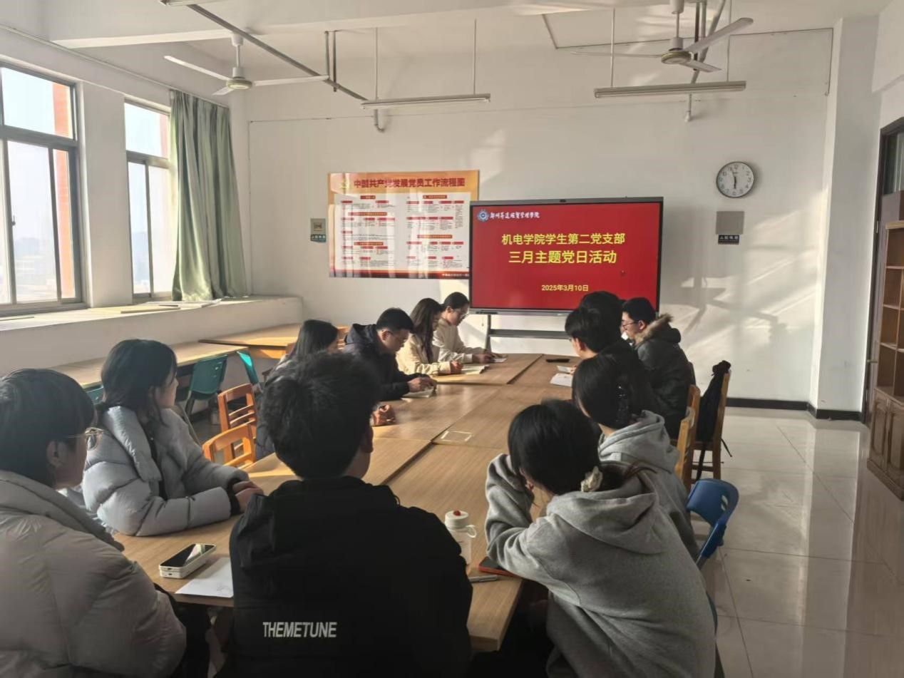 为深入贯彻落实习近平总书记关于弘扬雷锋精神和志愿服务的重要论述以及重要指示批示精神,引导广大师生树立“奉献、友爱、互助、进步”的志愿精神。2025年3月10日,机电学院学生第二党支部在实训大楼616党建会议室召开专题学习会,支部全体党员、入党积极分子参加会议,会议由支部书记杨亚梦主持。
