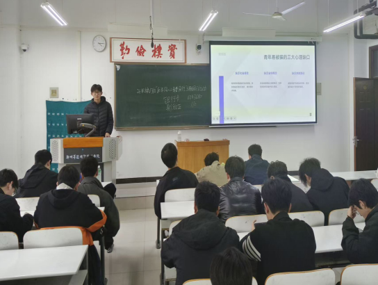 班级团支书结合校园诈骗案例强调反诈重要性。随后,五组同学代表登台展示反诈成果:王洪明等四位同学通过PPT,拆解刷单返利、虚假中奖等常见诈骗类型并分享防骗技巧。